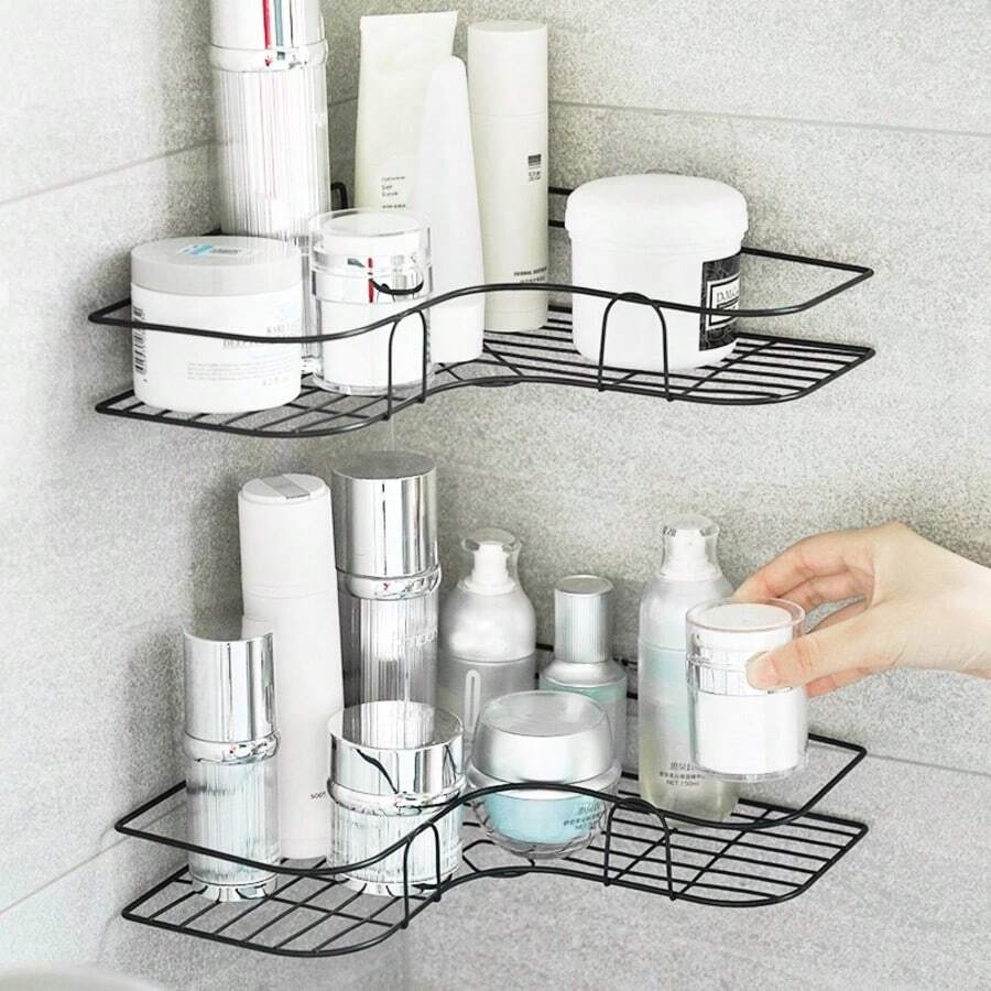 1/2 piezas Estante de baño de esquina de hierro con ganchos adhesivos, estante de almacenamiento triangular para artículos de tocador de baño, accesorios de estante de esquina para baño, sin necesidad de perforar, negro