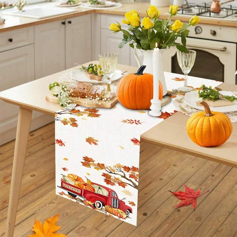 1/25 piezas Tema de otoño, Camioneta y calabazas, Mantel de mesa de lino con estampado de hojas de arce, Adecuado para fiestas, cumpleaños, decoración de cocina y comedor, decoración de muebles y textiles para el hogar. Es una decoración del hogar multiusos adecuada para todas las temporadas, perfecta para decoraciones de fiestas y festivales, y también un excelente regalo para padres y amigos.