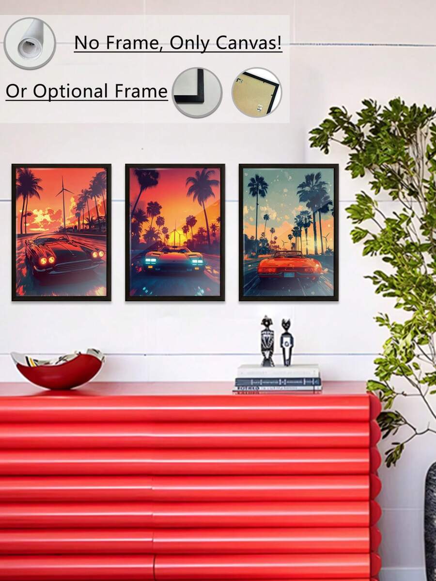1/3 piezas, marco opcional, pintura de alta calidad, estilo moderno, coche deportivo, ilustración, puesta de sol, vacaciones, árbol de coco, puesta de sol, amantes de los coches, póster de arte de pared, decoración del hogar, adecuado para sala de estar, sofá, dormitorio, pasillo, baño, oficina, regalo de arte perfecto, embalaje de tubería rígida de PVC
