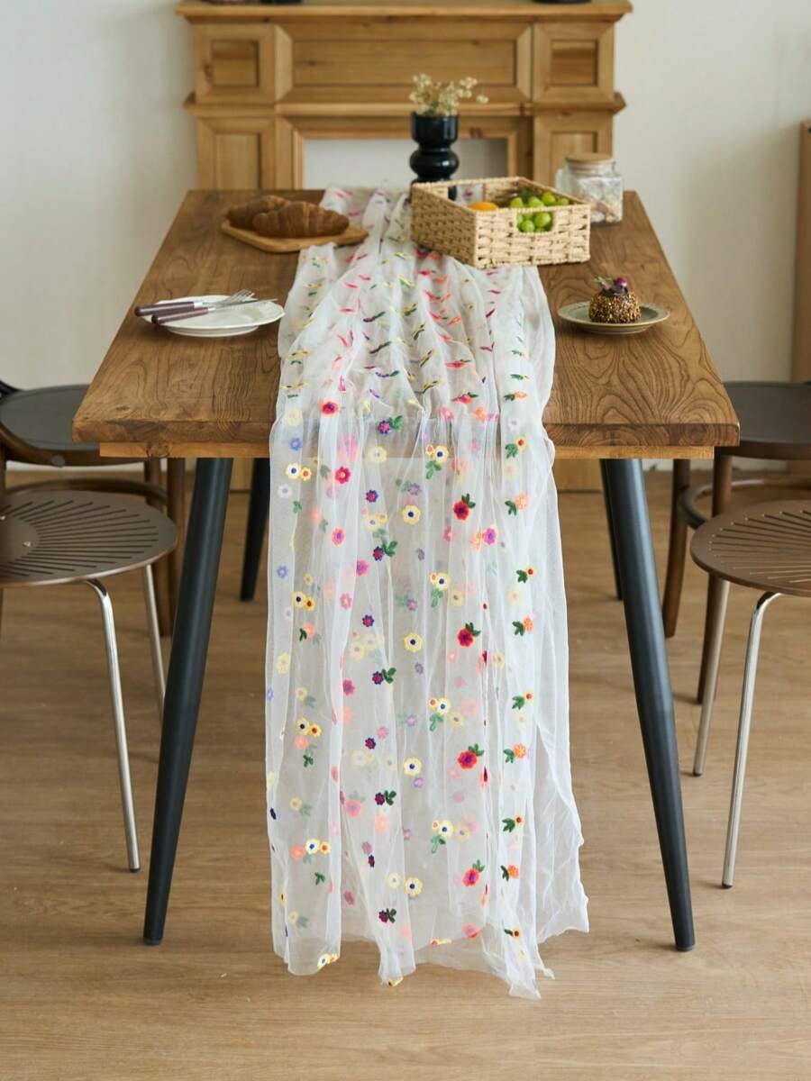 1 pieza Mantel con bordado de encaje y diseño floral colorido, estilo minimalista romántico francés para decoración del hogar y la cocina, adecuado para reuniones festivas, fiestas de cumpleaños, cenas de boda y como fondo fotográfico
