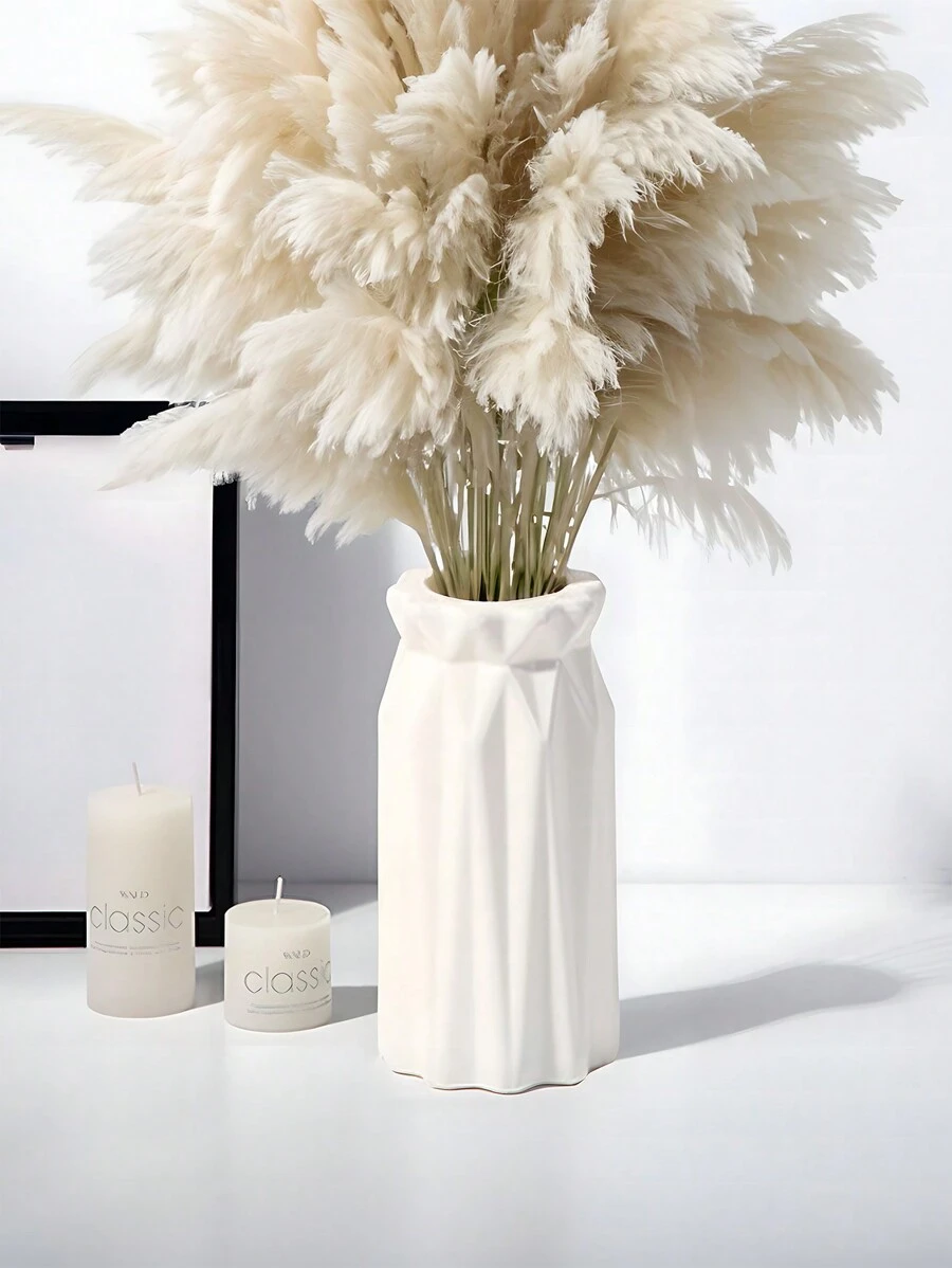 1 pieza Jarrón cilíndrico moderno y minimalista de plástico con apariencia de cerámica, con hierba pampa alta, jarrón blanco ondulado con textura, decoración floral artificial, centro de mesa para el hogar, boda, oficina