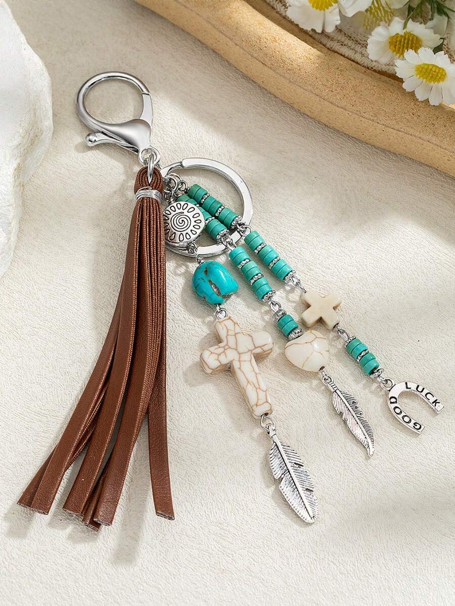 1 pieza Llavero de estilo vaquero occidental retro, llavero con colgante de borla, turquesa, cruz, hoja, herradura, llavero de cuentas de turquesa y borla, regalo de estilo occidental, llavero de cruz, decoración de borla, vaquera hippie occidental, llavero de coche, llavero de cruz, accesorio de bolsa, regalos para uso diario, hombres y mujeres, accesorios de coche/bolsa, mochila, recuerdo, regalo