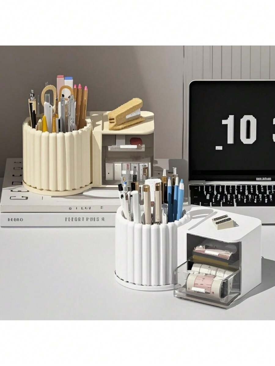 1 pieza Organizador de escritorio con soporte giratorio para bolígrafos y cajón pequeño, adecuado para almacenamiento en el escritorio del hogar