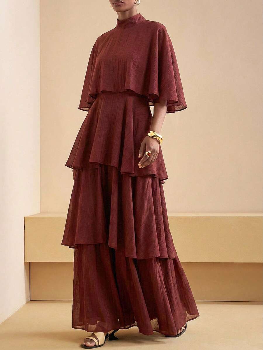 Zivah Blusa con cuello medio alto con volantes, de tela tejida transparente marrón, y falda larga con volantes de 3 capas, nueva llegada de primavera 2025 para mujeres