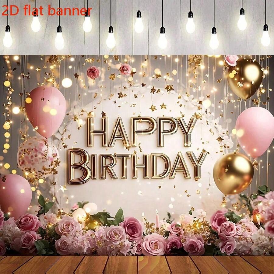 Pancarta de cumpleaños de poliéster plana 2D - Decoración de fiesta vibrante con elementos dorados (p. ej. "Reina del cumpleaños"), globos, diseño de patrón de champán y regalo, sin necesidad de energía, uso versátil para una celebración inolvidable y decoración de fiesta de cumpleaños.