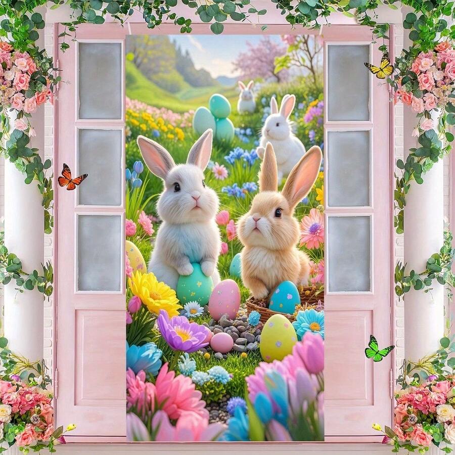 2 piezas planas, 1 pieza Decoración de puerta de conejito de Pascua - Material de poliéster, patrón de conejito en campo de flores de tono macaron, apto para decoraciones de jardín y fiestas interiores y exteriores, sin fuente de alimentación requerida, tema de conejito