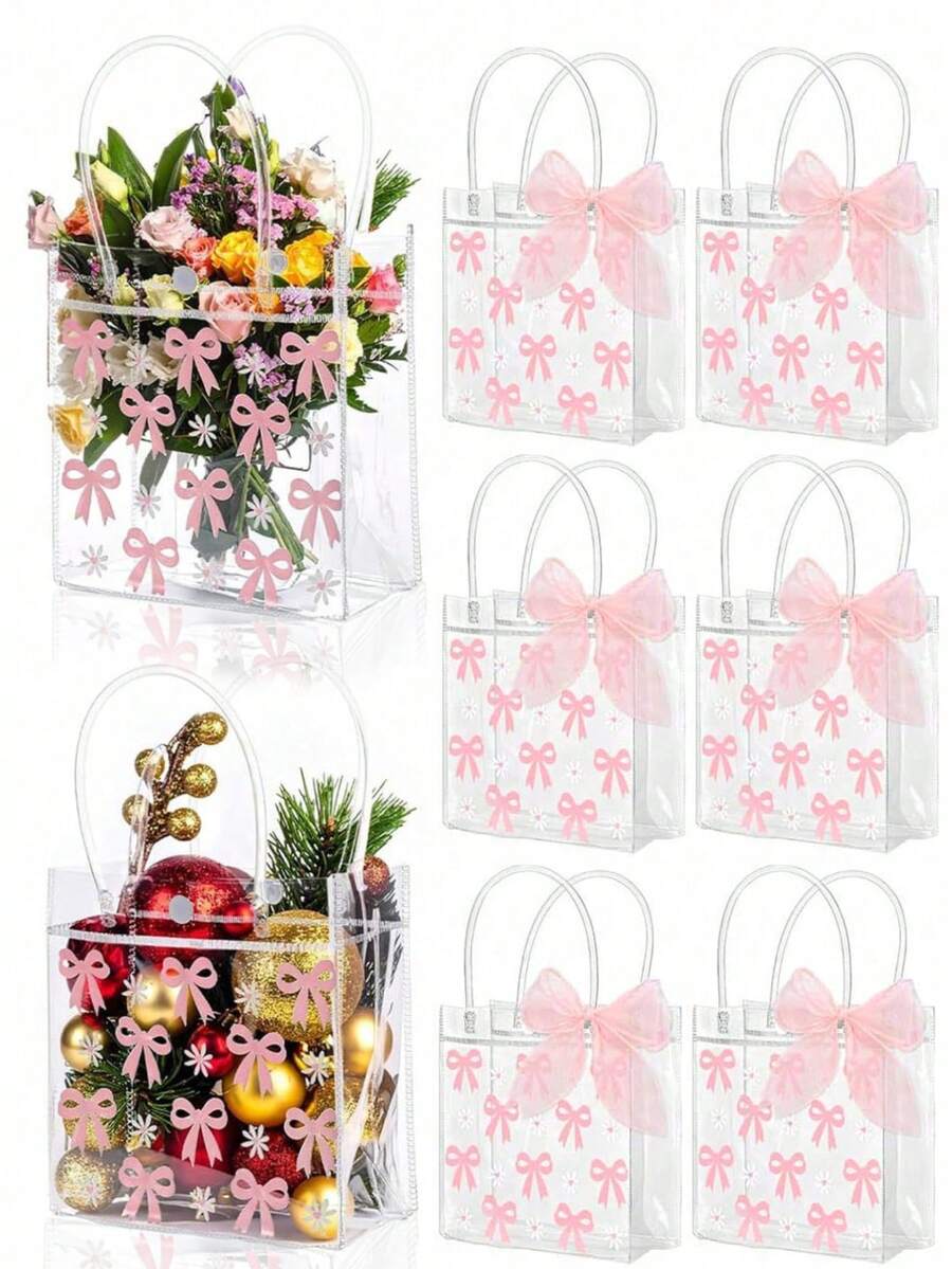 Set de 4/8 bolsas de regalo con decoración de lazos rosas para fiestas, cada una con asa, lazo rosa, nudo y flor margarita. Bolsas para obsequios de fiestas de cumpleaños, baby shower, día de la madre, bodas, etc. Suministros reutilizables para manualidades y decoración de fiestas (Navidad, graduación, despedida de soltera).