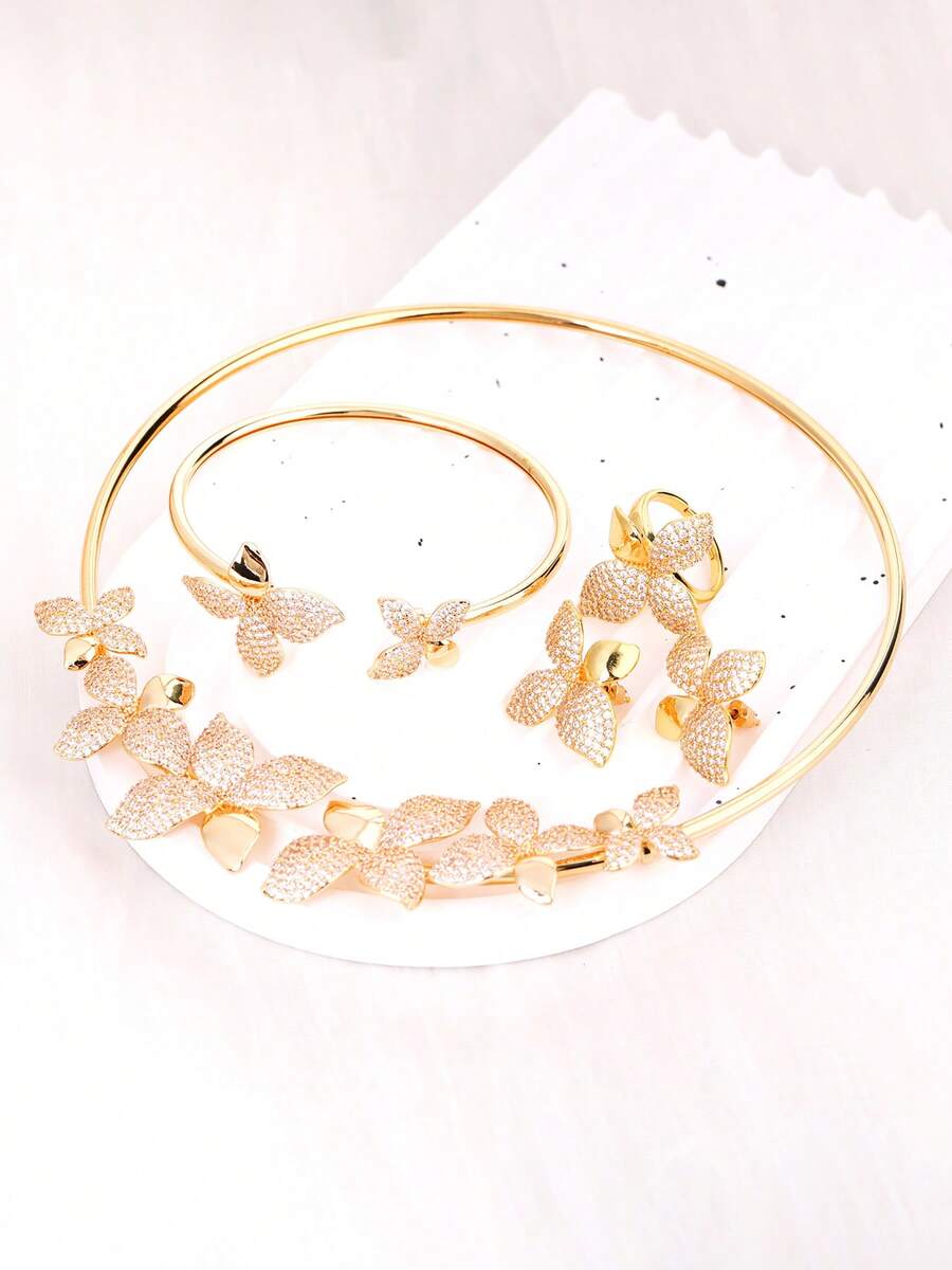 LIGHTSOME Set de 4 piezas: Collar de flor de circonita completa de lujo con pulsera, anillo abierto, aretes. Conjunto de joyas de charm choker de cobre con circonita para mujer, regalo para el Día de San Valentín