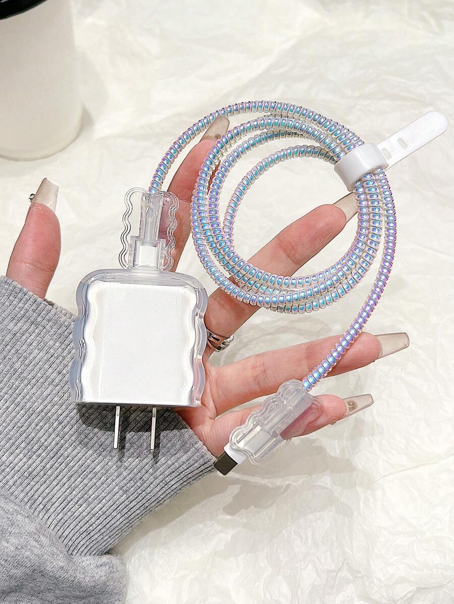 Set de 5 piezas de protectores transparentes con diseño de ondas marinas - 1,5m dispositivo enrollador, fijador de cable, cable de datos anti-rotura, cubierta protectora del cabezal de carga TPU, compatible con cable de carga rápida de 20 w de las series Apple 12/13/14, protector de cable y protector de cargador