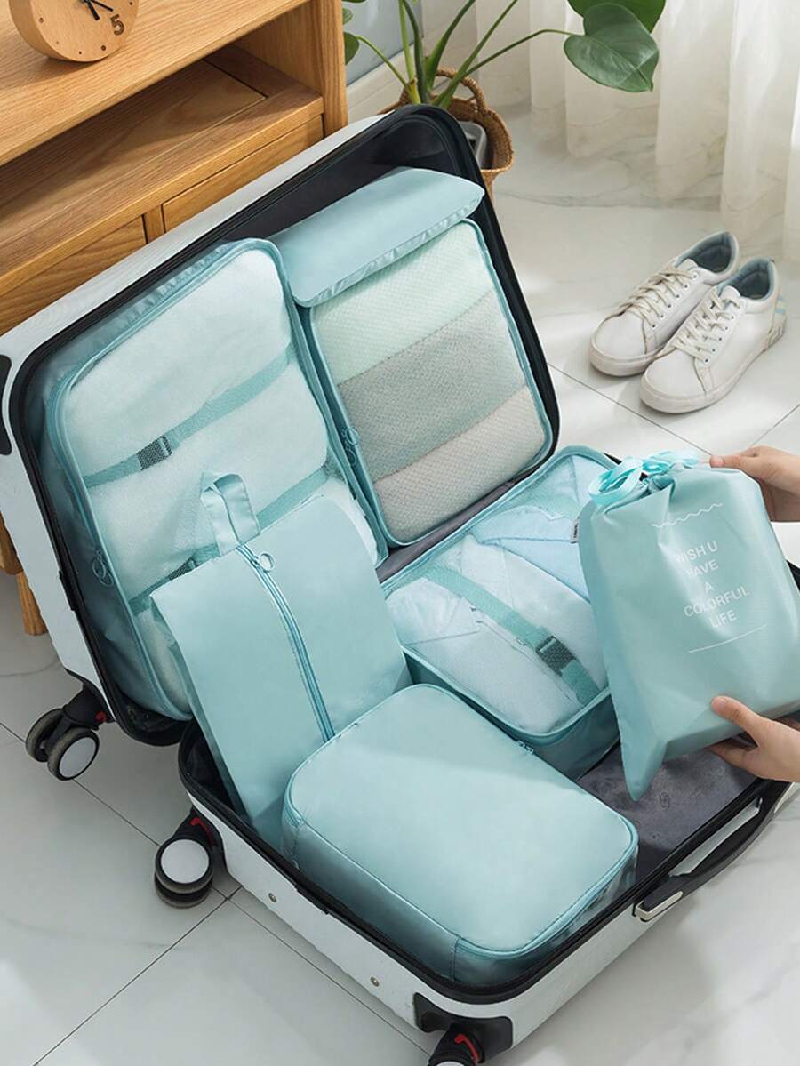Juego de 9 en 1 Organizador de almacenamiento de viaje, cubos de embalaje plegables para el equipaje que incluyen bolsa de aseo, bolsa de maquillaje, bolsa de ropa interior, bolsa de zapatos, organizador de lencería y calcetines, bolsas de almacenamiento plegables para la ropa, adecuado para maletas