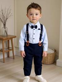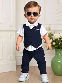 Fern GlowSHEIN Set de 3 piezas de traje de caballero para niño/niña: Camisa de manga corta blanca, chaleco, pantalones cortos/largos. Conjunto elegante apropiado para primavera/verano, para usar en casa, salidas, fiestas de cumpleaños, bautizos, primer cumpleaños, ceremonias, bodas, paje, portador de anillos