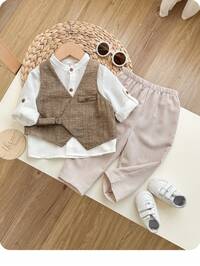 Fern GlowSHEIN Conjunto de 3 piezas de ropa de niño pequeño estilo caballero, que incluye: body de manga larga blanco, chaleco gris beige y pantalones, cómodo, con estilo clásico y retro, elegante y lindo, estilo británico, adecuado para interior, exterior, diario, deportes, juego, fiesta, sesión de fotos, vacaciones, festival, boda, baby shower, Navidad