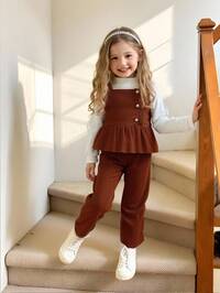 HappikinsSHEIN 2 piezas Blanco crema, lindo conejo azul de dibujos animados con patrón de puntada, ribete de contraste rosa, conjunto de camiseta de manga corta holgada de cuello redondo y pantalones acampanados para niña joven, adecuado para primavera y verano, atuendos para comodidad fácil, niños con estilo, ropa casual, ropa con gráfico de dibujos animados de puntada, de vuelta a la escuela, homecoming, relajado