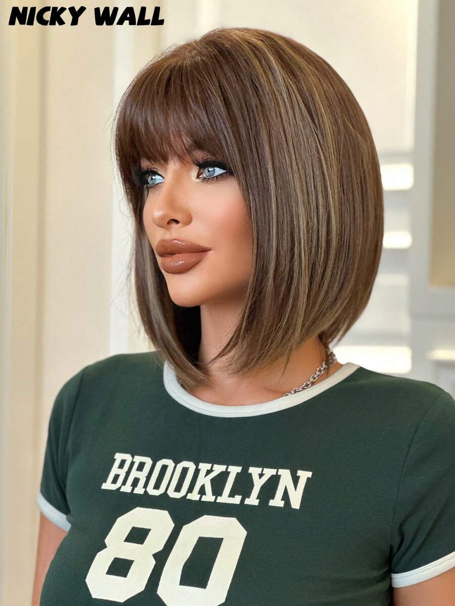 NICKY WALL Peluca corta y recta de 12 pulgadas para mujeres, peluca bob de color marrón con flequillo, fibra sintética resistente al calor de alta densidad y esponjosa para uso diario y de fiesta