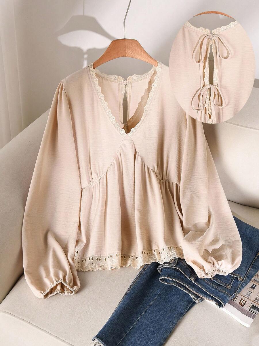 CosyJoli Blusa de moda con cuello en V, mangas farol, lazo en la espalda y dobladillo con volantes para mujer de talla grande