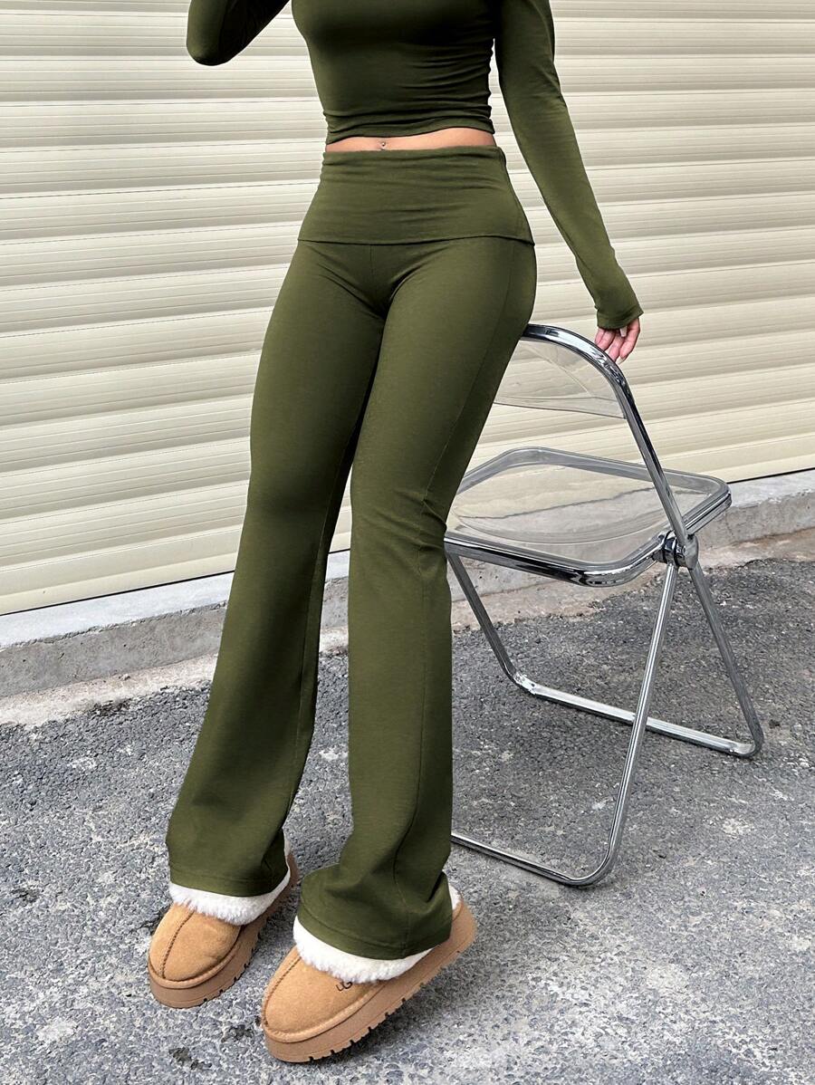 Pantalones anchos de cintura ancha de unicolor casual para mujer, leggings delgados de cintura alta con pliegues