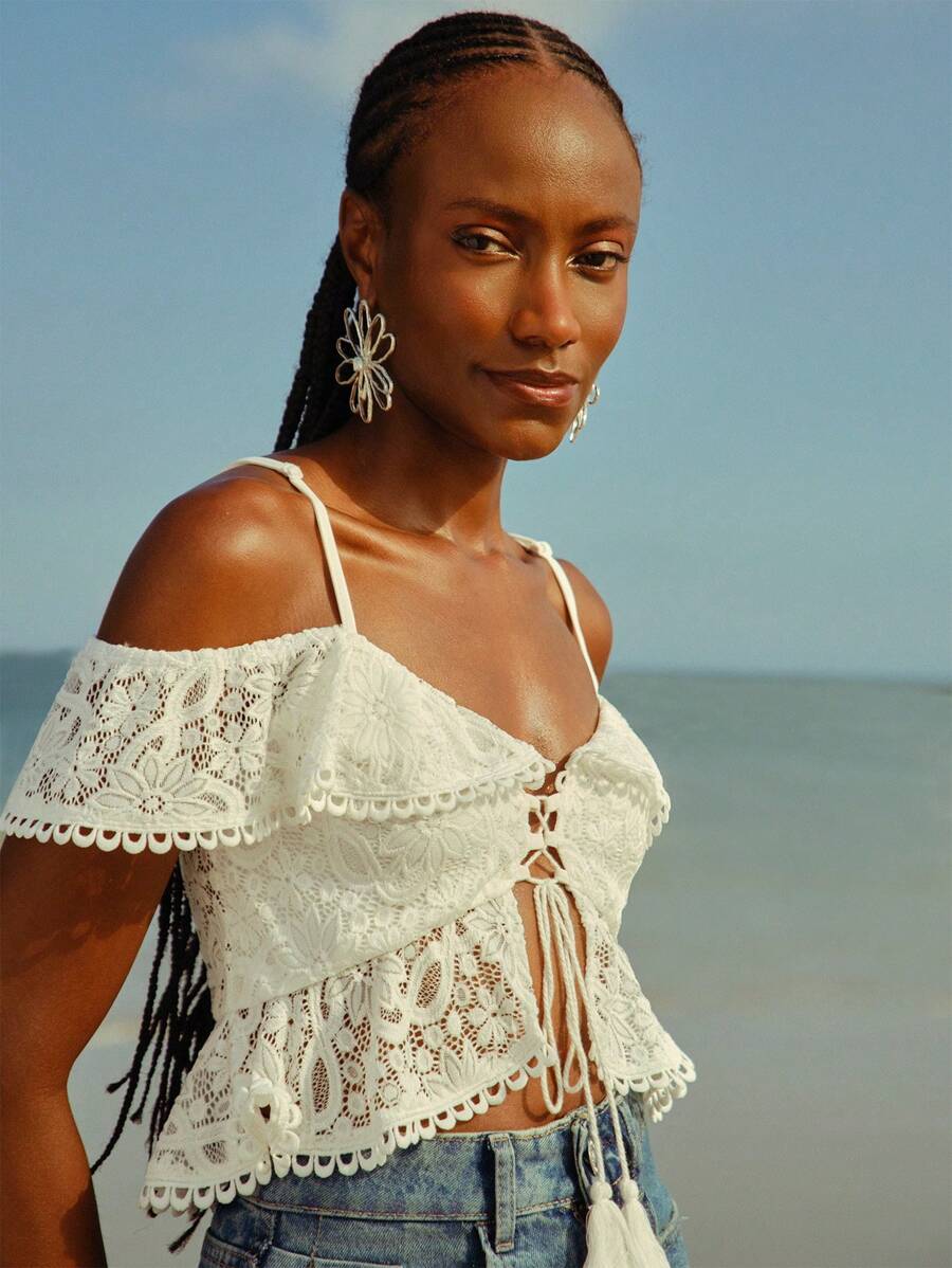 CAJUNI Conjunto de 2 piezas de verano para vacaciones y playa, compuesto por top halter con escote en V y adorno de encaje con borlas + shorts triangulares blancos