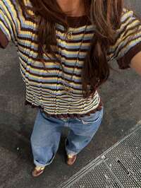 PariauraCamiseta de punto de manga corta con cuello redondo, a rayas y contraste de color, suelta, casual, de vacaciones, de estilo casual diario y de calle, estilo callejero Y2K, retro, para mujer, top a rayas, suéter de punto para mujer