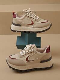 Flipark Sneaker ShoesZapatillas deportivas gruesas de mujer para primavera/otoño, zapatos casuales con malla transpirable, suela gruesa, talón de cuña, boca poco profunda, ligeros y versátiles, de moda, con cordones, en blanco, gris, rojo vino, tallas 36-41