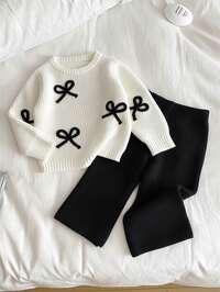 Genkimix KidsGenkimix Kids Conjunto de suéter de punto con lazo y pantalones largos de punto versátil y lindo para niña joven. Conjunto de suéter y pantalones, conjunto de ropa con lazo, conjunto de pantalones de dos piezas, conjunto de punto de dos piezas, conjunto de atuendo de dos piezas para niña joven, conjunto de dos piezas, conjunto de traje de primavera y otoño para niñas, ropa de otoño e invierno para niñas, conjunto de falda, conjunto de suéter de dos piezas para niñas jóvenes, conjunto acanalado para niñas, conjunto de punto para niñas, conjunto de suéter de dos piezas para niñas jóvenes, conjunto lindo de niñas jóvenes, conjunto de punto para niñas, conjunto de pantalones para niñas, conjunto cómodo para niñas, conjunto de invierno para niñas jóvenes, ropa de estar en casa para niñas, conjunto cómodo para niñas, conjunto de manga larga para niñas Set de 2 piezas de suéter de cárdigan con cuello en V con estampado floral jacquard y pantalones de punto para niñas jóvenes, suave y cómodo, adecuado para primavera, otoño, invierno, uso diario, al aire libre, viajes, vacaciones, hogar, guardería, juegos de niños